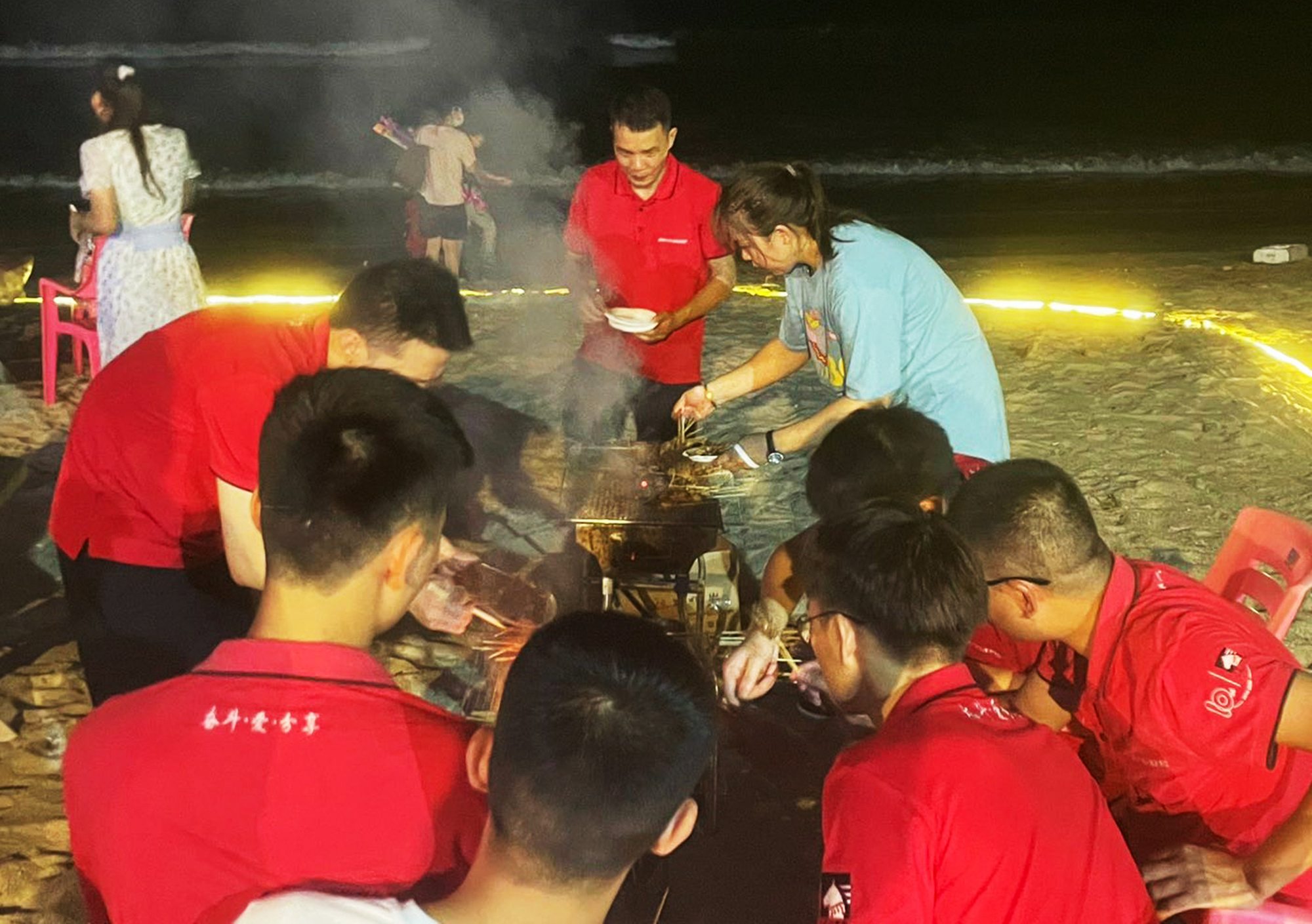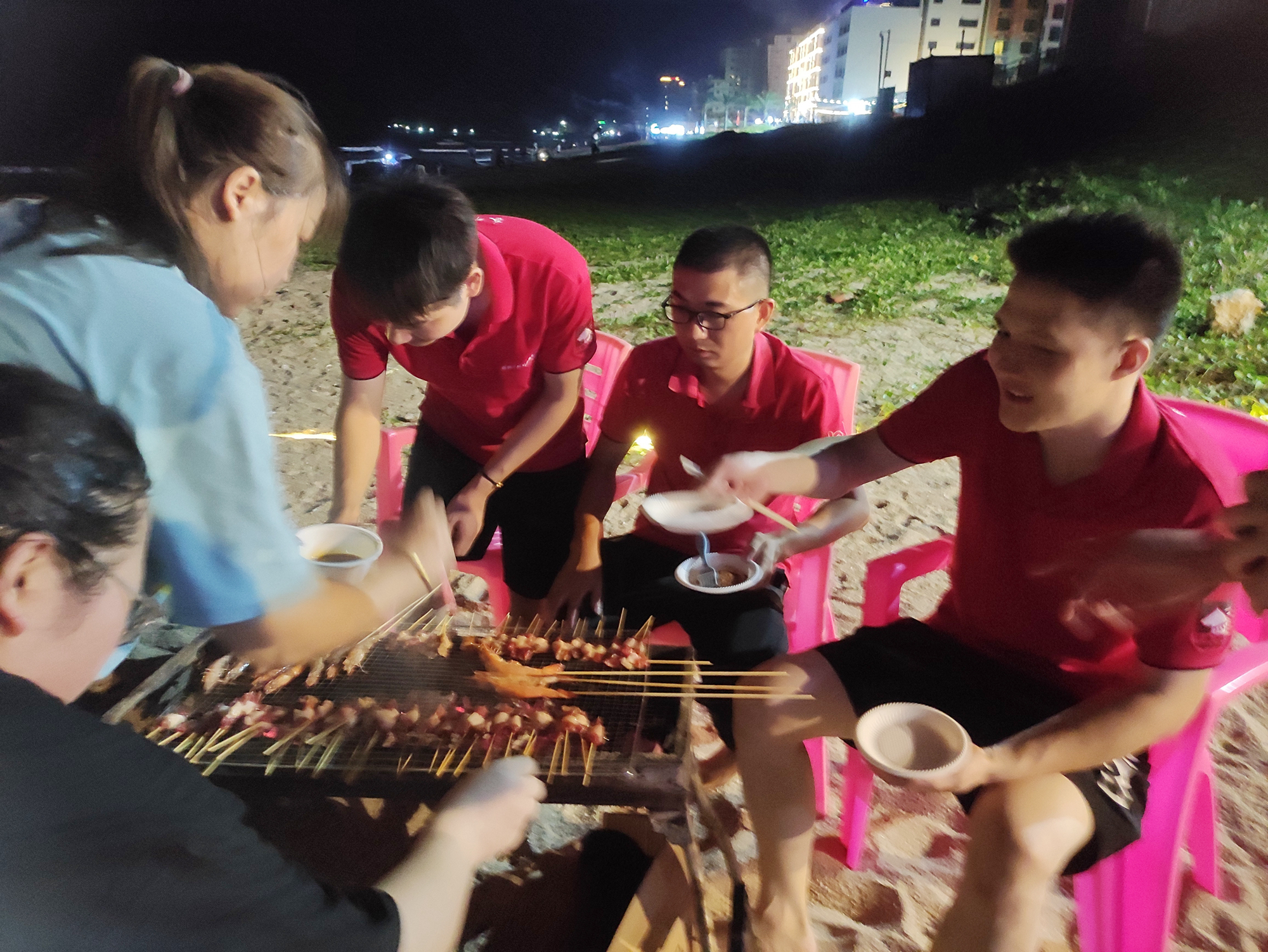 激動的戶外拓展過后,已經(jīng)是傍晚時分,是時候準備一頓別樣的晚餐了。于是三五人洗菜切菜,八九人圍坐穿串,往日嚴肅少言的領導,這一刻和大家一樣,都是穿串的“手工藝人”。